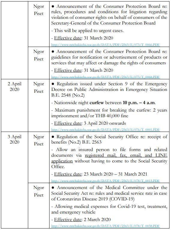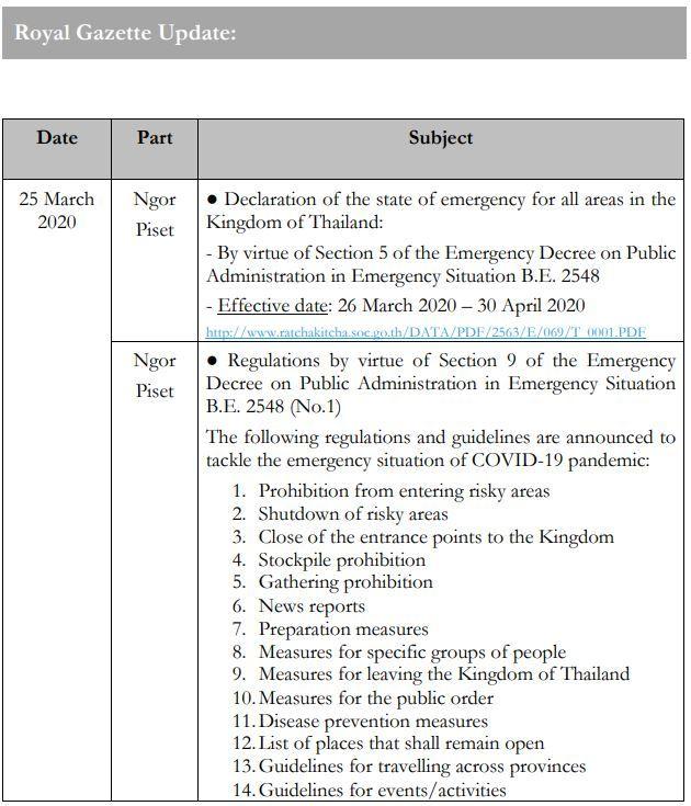 - The government declared a state of emergency for all areas in Thailand between 26 March 2020 – 30 April 2020 and imposed the following regulations and guidelines to tackle the emergency situation of COVID-19 pandemic (for more information, see Royal Gazette below):
